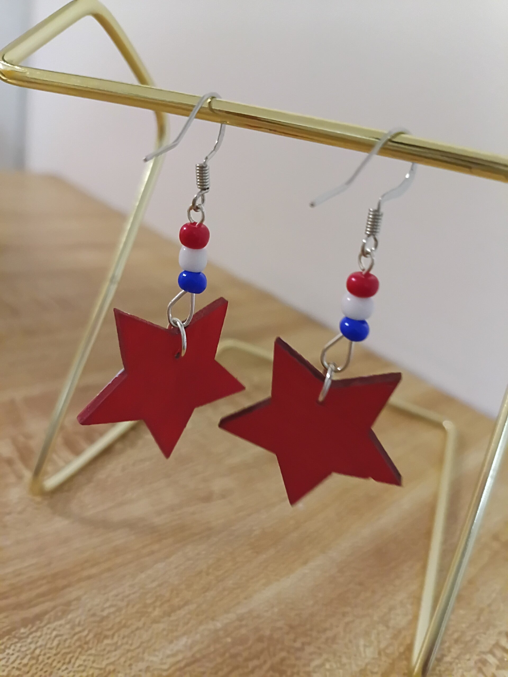 Wooden Star painted by hand and sponge. Crafted into dangle earrings. Red, white and blue glass beads. Fishhook backings.