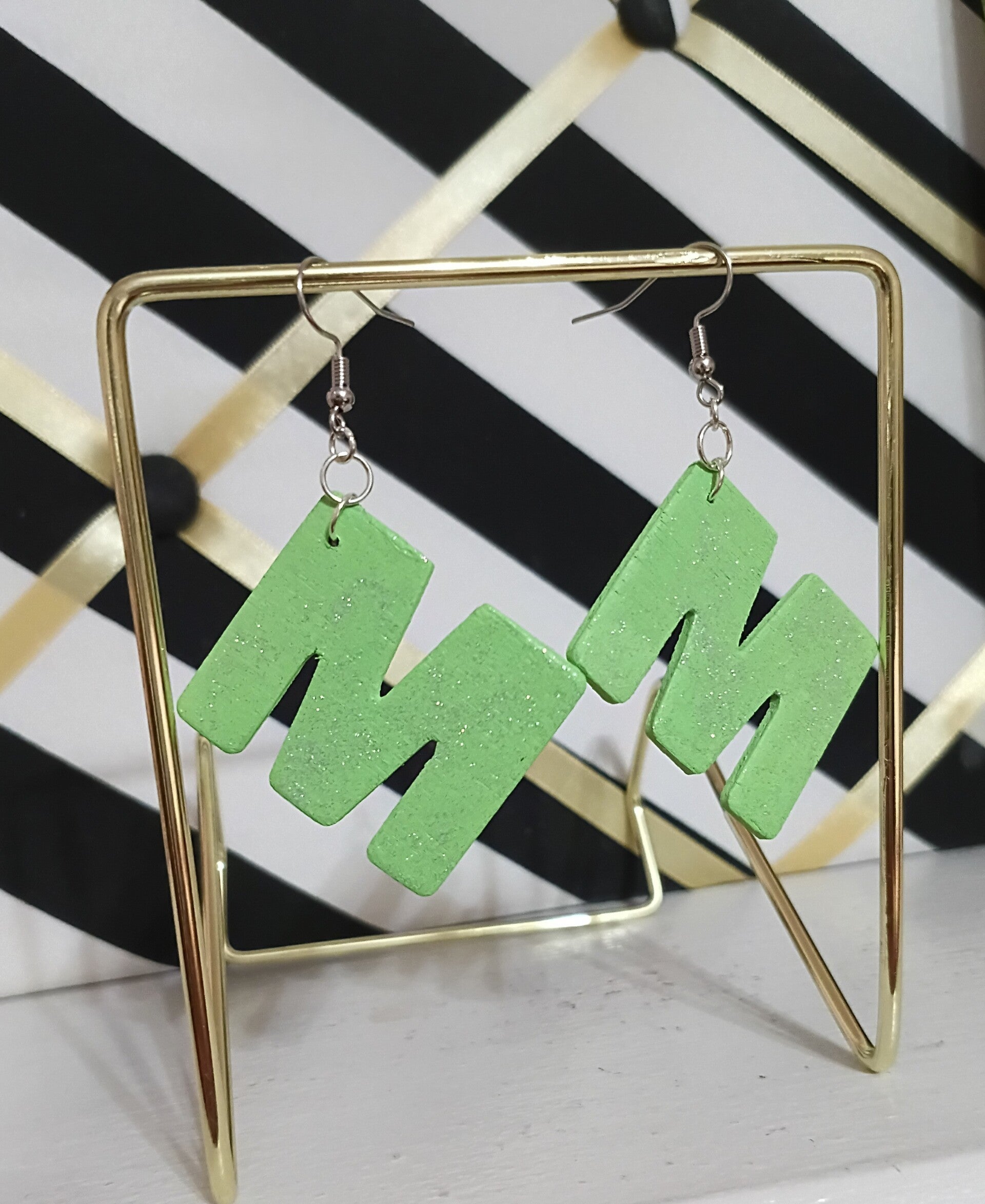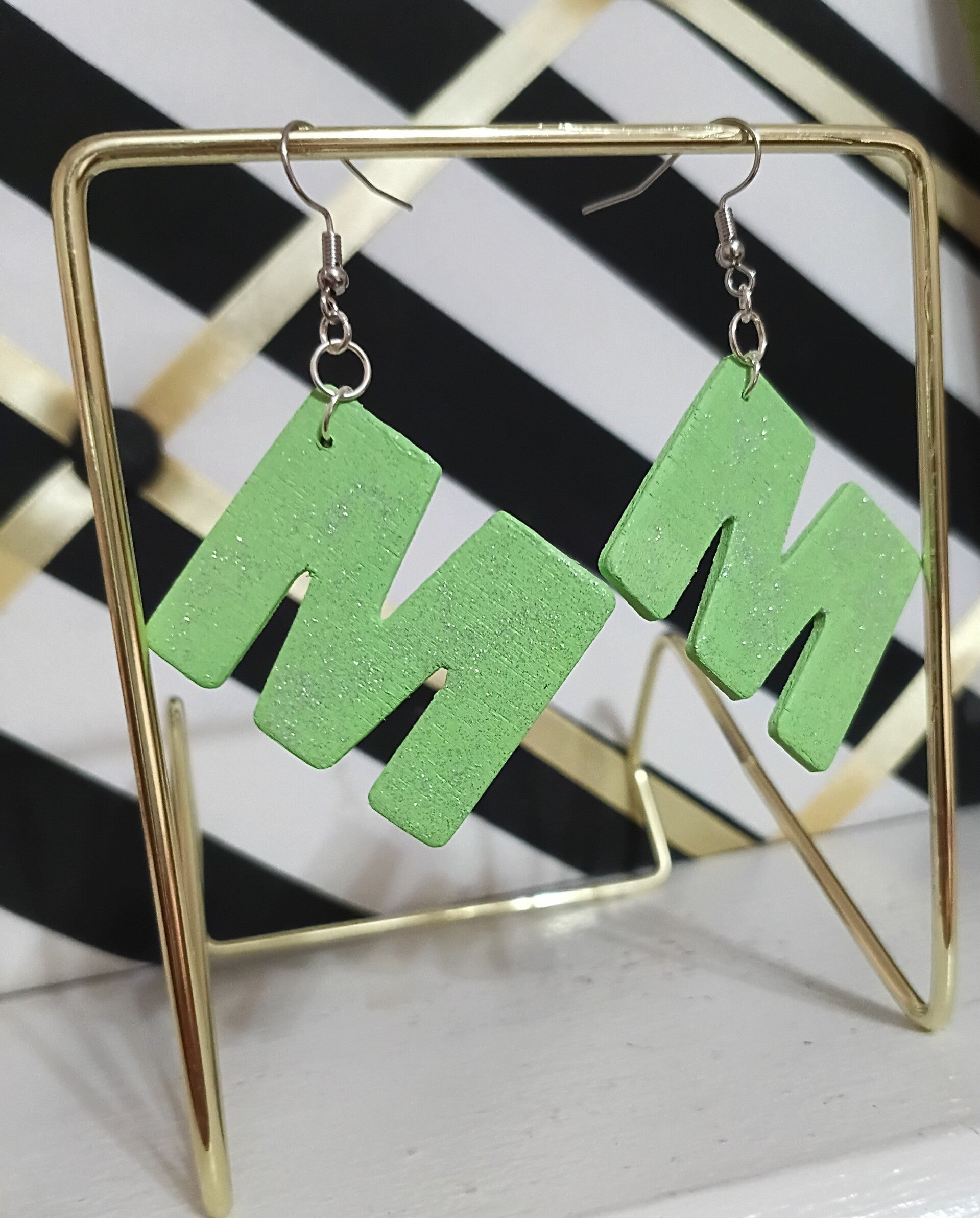 Letter M earrings made of wood painted by hand. Light green in color. Painted with silver glitter glue for finish. Fishhook earwire/nickel free.