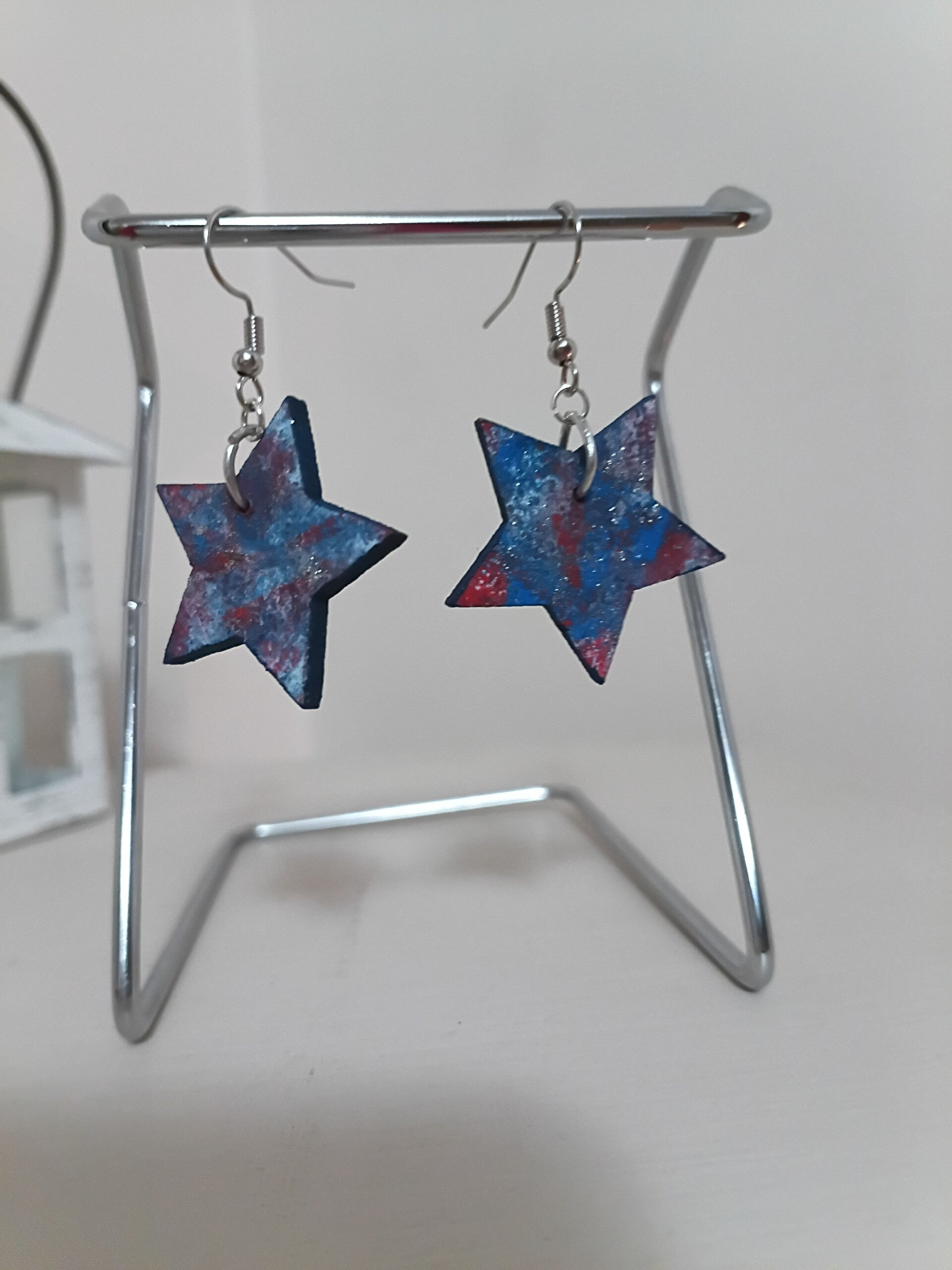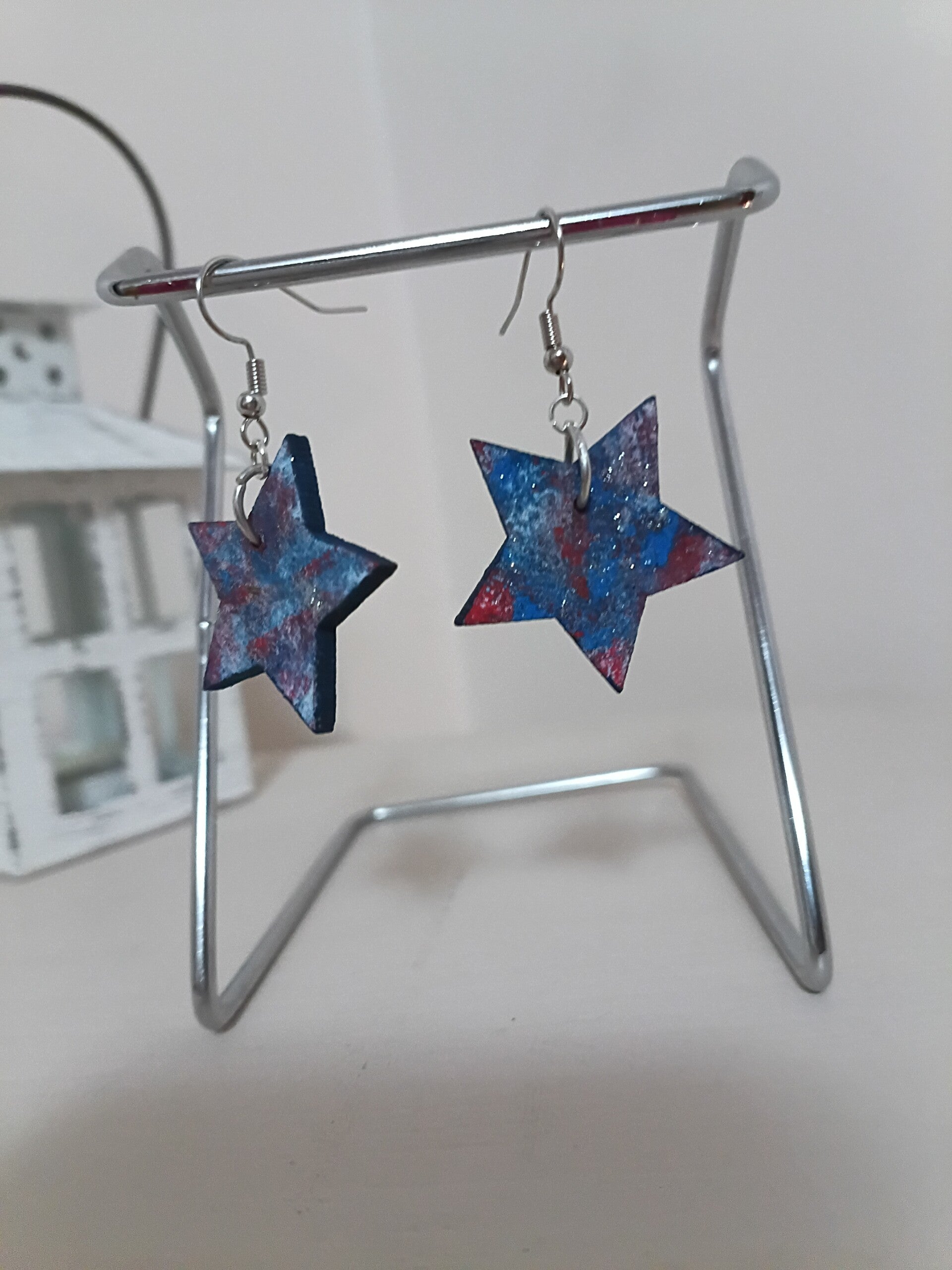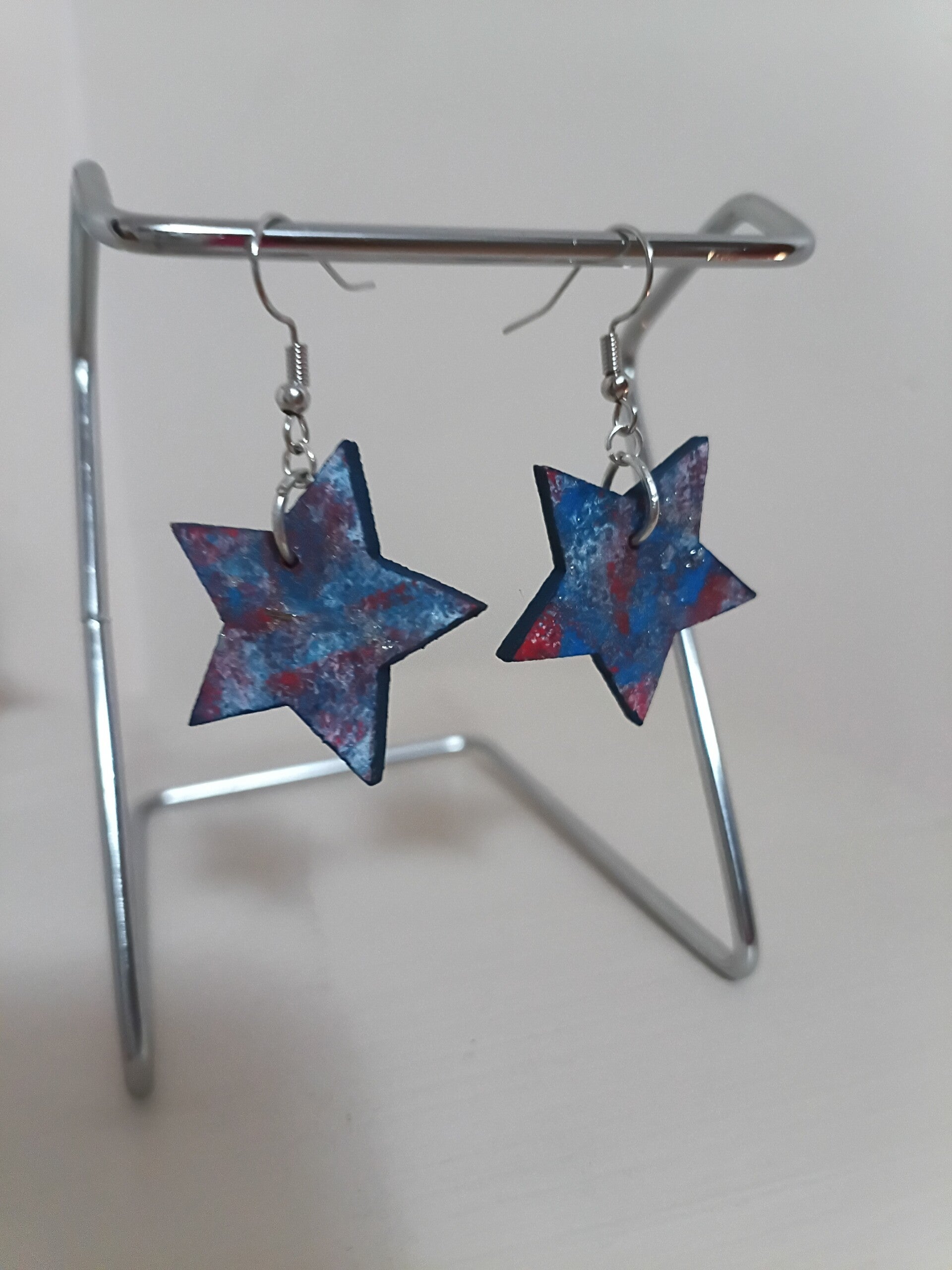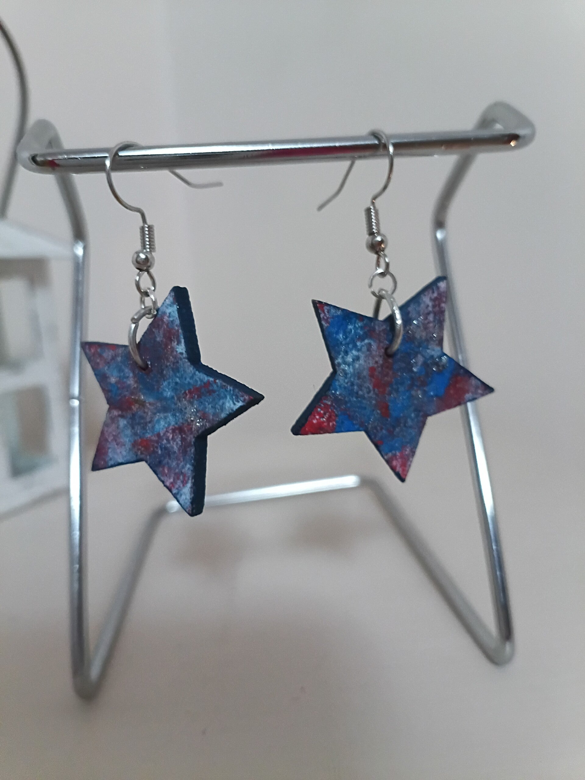 Wooden Stars crafted into earrings. Painted by hand and sponge. Red, white and blue in color. Short fishhook earwire/nickel free.