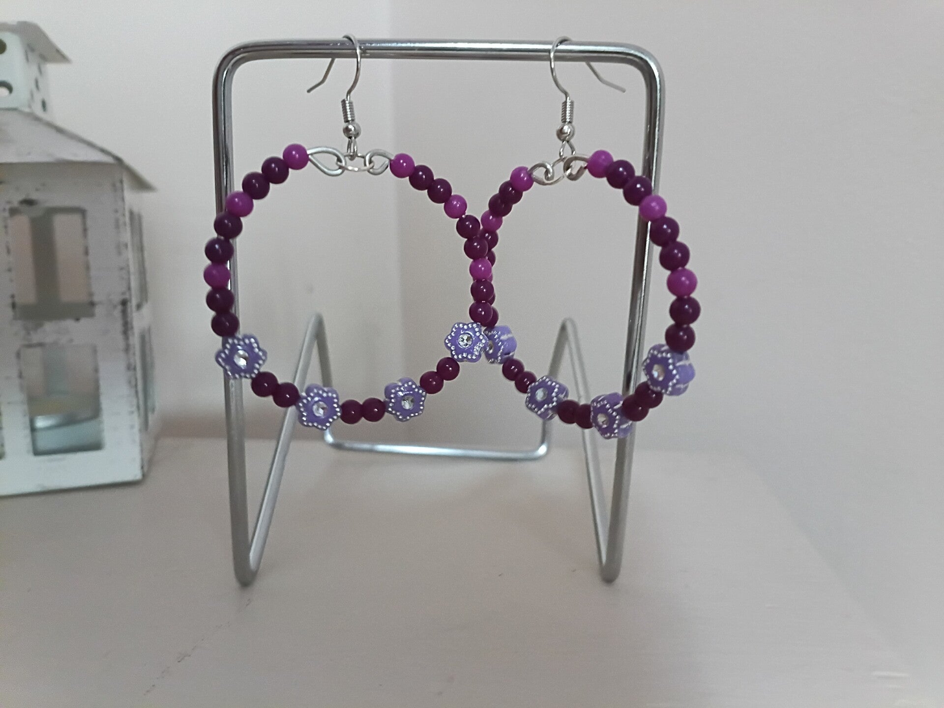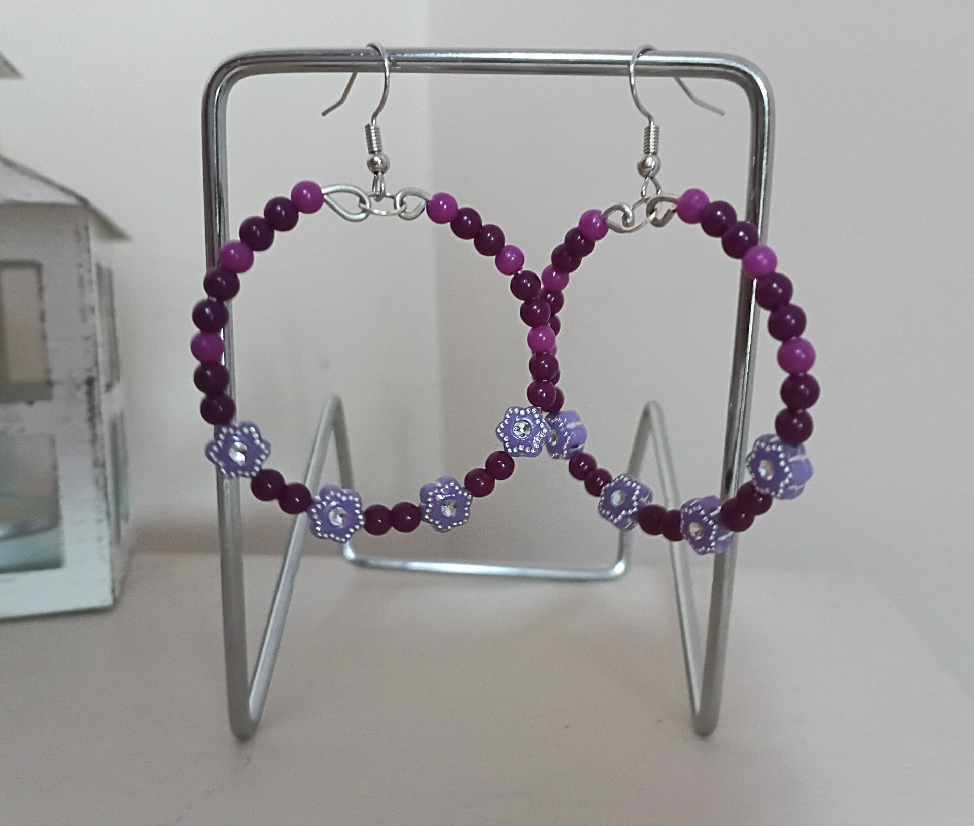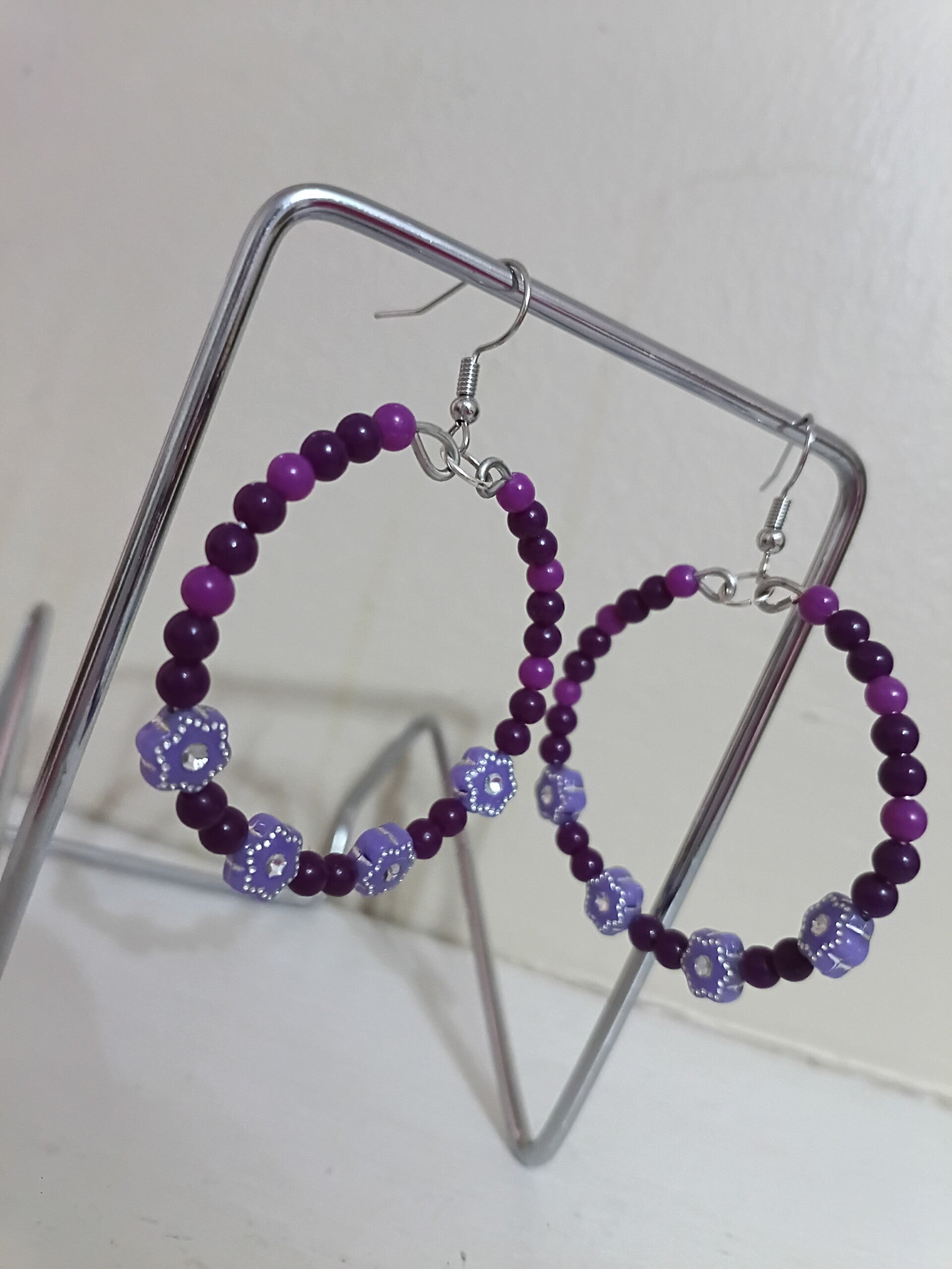 Handmade beaded hoop earrings. Light and dark purple plastic beads. Rhinestone flower beads. Short fishhook earwire/nickel free